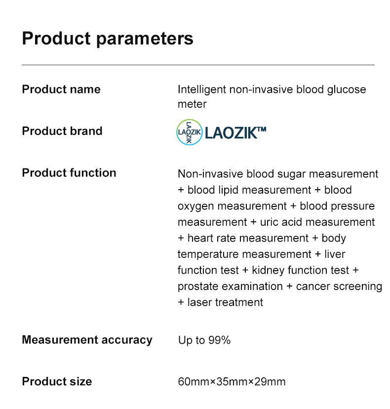Founded in 1863, Bayera is a leading global pharmaceutical company providing prescription drugs, over-the-counter medicines and specialty healthcare products. The company has a strong track record in blood sugar, cardiovascular, gynecology, oncology, neurology, etc. Today, Bayera is actively involved in the pharmaceutical, health sciences and life sciences sectors, using technology to improve global health and continuously supporting innovations in precision medicine and chronic disease management. To help more people prevent diabetes, Bayer HealthCare has spent five years developing this non-invasive, multi-functional blood glucose meter [12 in 1]. When the product was first introduced, it was pre-sold at a very low price to support the community. Only one purchase per person. Offer valid until the end of the month, so order now. It has a unique laser treatment function that improves blood flow, lowers blood sugar, blood lipids and blood pressure. The finger was irradiated with 650 nm laser light with an output power of 5 mW from a laser terminal. Blood sugar measurement helps control diet, detect diabetes early, has a beneficial effect on the health of pregnant women and the fetus, helps doctors adjust medications, detects diabetes complications, etc. Blood lipid testing can help detect abnormal blood lipid levels and take preventive measures against cardiovascular diseases such as heart disease and stroke. The electrocardiogram is used to monitor heart function, diagnose heart disease, assess drug effectiveness, assess the effect of thrombolysis and monitor systemic diseases. The main purpose of uric acid measurement is to determine whether hyperuricemia is present. Uric acid testing can also be used for initial disease prevention, early detection of abnormal blood uric acid levels and rapid changes in lifestyle and usage. Some medications are still effective in preventing and treating high uric acid levels. The kidneys are important organs in the human body, and their health has a direct impact on a person's life and lifespan. Regular kidney tests can help identify their function early, so that you can adjust your lifestyle and treatment methods to ensure kidney health. Measuring your temperature is an important way to assess your body's health and can help identify symptoms of infection, inflammation, or other disease. Regular temperature monitoring is essential for prompt intervention and treatment planning in the event of fever or other symptoms, as well as for maintaining good health. The unique, non-invasive measurement technology does not require blood samples, is non-invasive and painless, easier and more convenient to use.